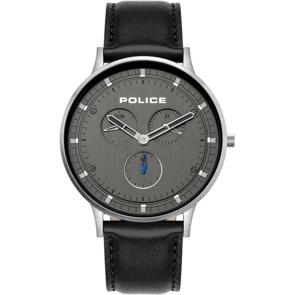 This Police Berkeley watch has a black leather strap and a grey dial. The case is stainless steel with a quartz movement. The day and date are displayed using sub-dials