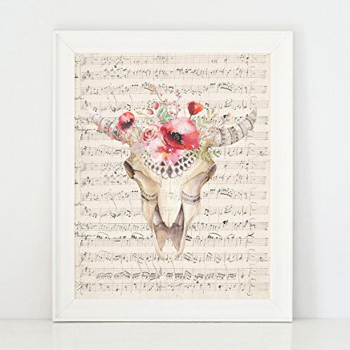 This quirky and playful home interiors art print is of a decorated ram’s skull with a flower head dress on a printed background of old music paper.