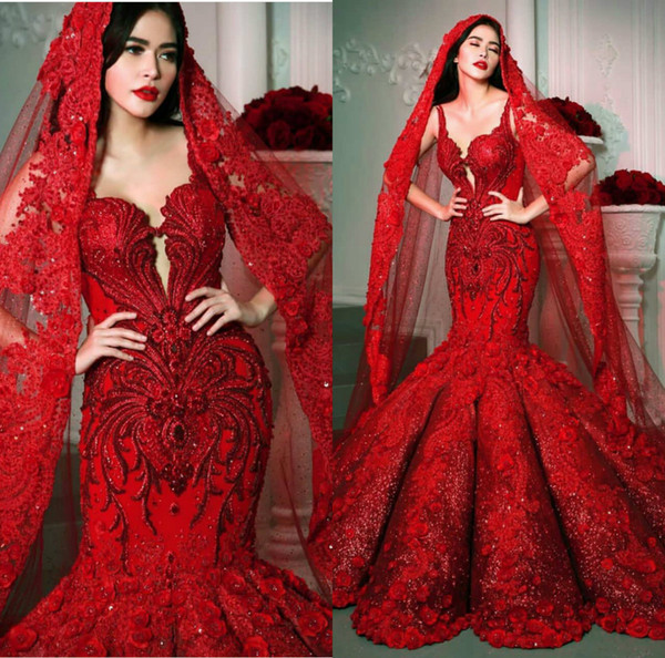 Red Mermaid Wedding Dresses Sexy Spaghetti Strap Sleeveless Appliqued Beaded Sequins Bridal Gown Custom Made Sweep Train Vestidos De Novia