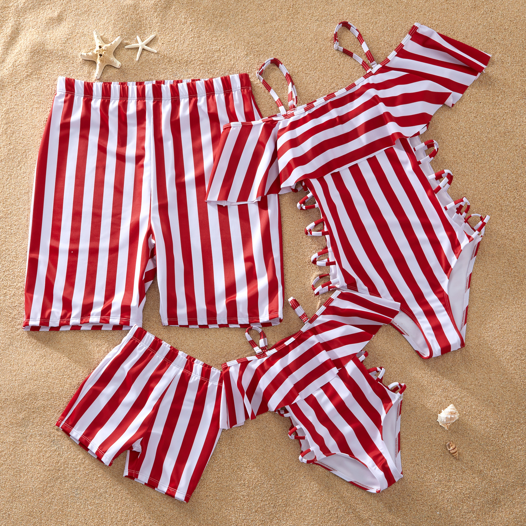 Red Striped Big Ruffle Family Swimsuits
