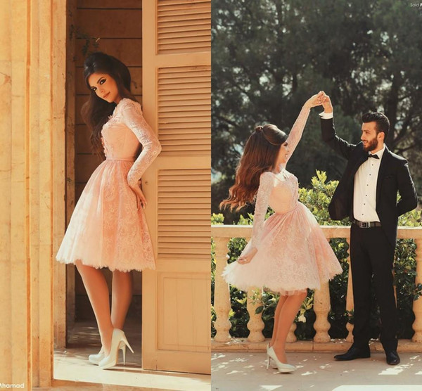 Romantic Pink Sexy Party Dresses Long Sleeve 2021 V-Neck Delicate Lace With Flower Beads Knee-Length A Line Party Dress
