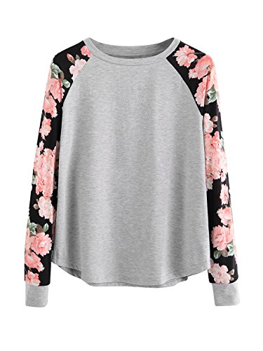 ROMWE Women’s Long Sleeve Top Casual Floral Print T-Shirt Tee Grey S