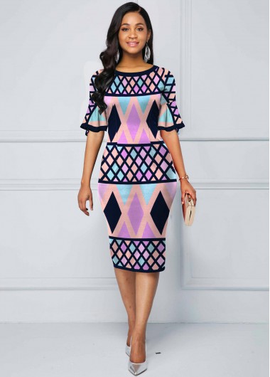 ROTITA Multi Color Flare Sleeve Geometric Print Dress