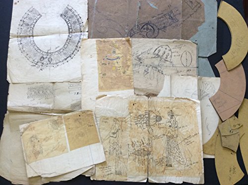 The drawings include: a highly detailed design for a necklace, executed in charcoal and labeled with the names of gems in pen, with three drawings of smaller ornaments mounted on the verso; 2 costume sketches in pencil with jewelry and headdresses painted in blue, yellow, white, and green, mounted back-to-back, one noted as the first costume for [Blanche] Deschamps-Jéhin, who played Dalila; two costume drawings in ink, labeled with the names of fabrics and mounted side-by-side, with further drawings of jeweled ornaments mounted on the verso; two small pencil drawings of ornamental headdresses and breastplates, mounted side-by-side; and several larger drawings of jewelry details. The drawings are overall in fair to good condition, with heavy wear, creases, and significant splits and tears, ranging in size from 8 x 10 inches to 26 x 22 inches. The cardboard templates are in fine condition, measuring from 2 x 2 to 11 x 12 inches.