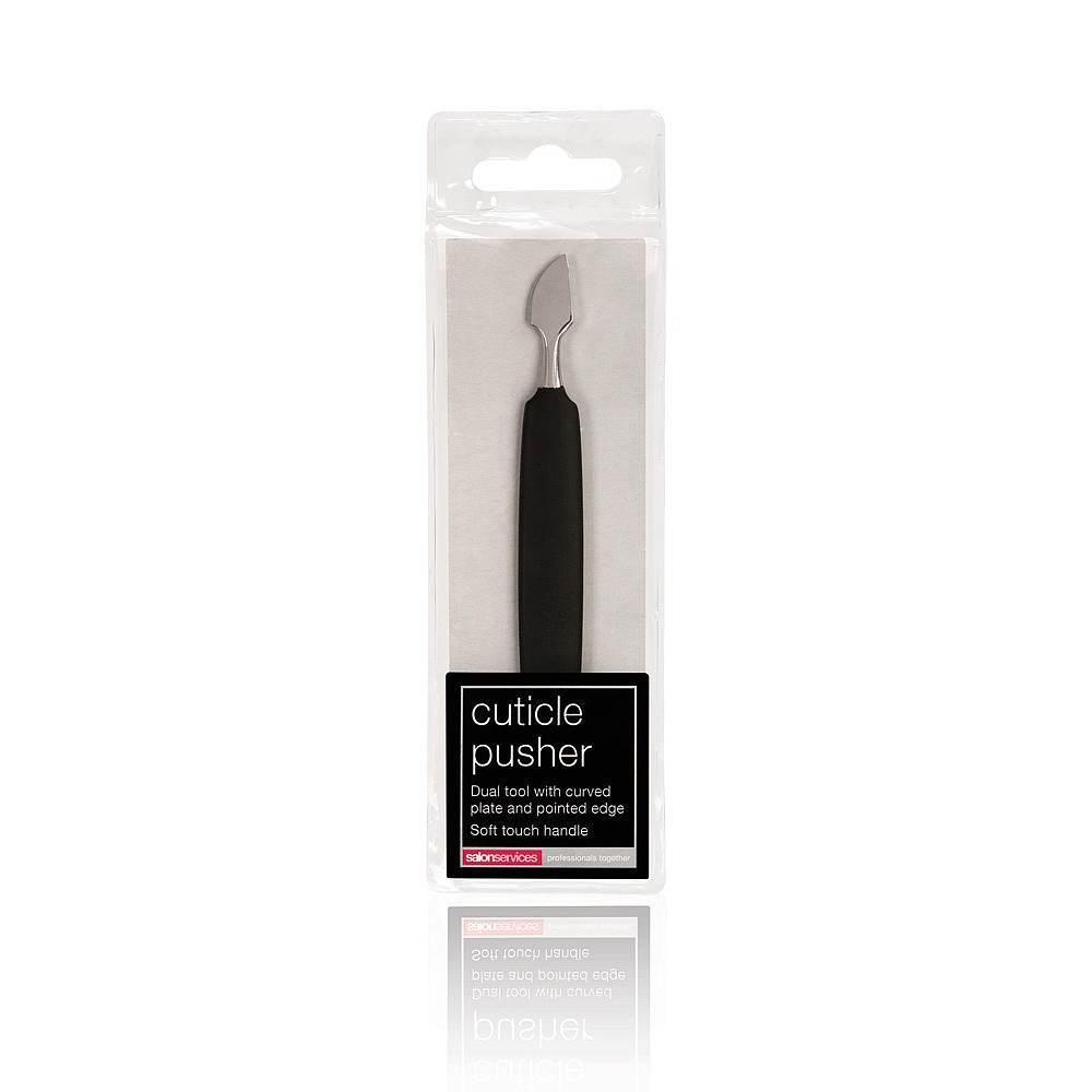 Tame unruly cuticles and maintain them between treatments with this cuticle pusher from Salon Services. This dual-ended metal tool has a curved plate for removing cuticles from the nail gently and without scratching. Also features a pointed edge and a soft handle for comfort.