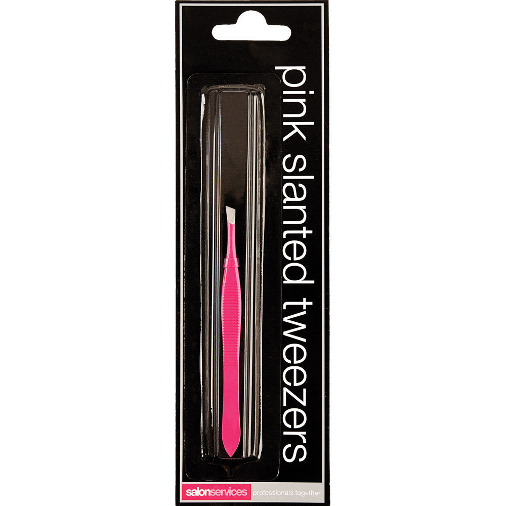 slanted tweezers from salon services straight tip secure grip hygienic and sterilisable stainless steel in pink