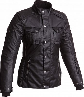 Coated serica textile Leather panels Waterproof & breathable membrane Aluminium removable thermal lining Personal Protection Equipment approved shoulder protectors Adjustable approved elbow protectors Pocket for approved back protector Fixed mesh lining Zipped ventilations Side smock Fixed mesh lining 6 outer pockets including 1 arm pocket 3 inner pockets Press stud waist fastening Padded elbows and shoulders