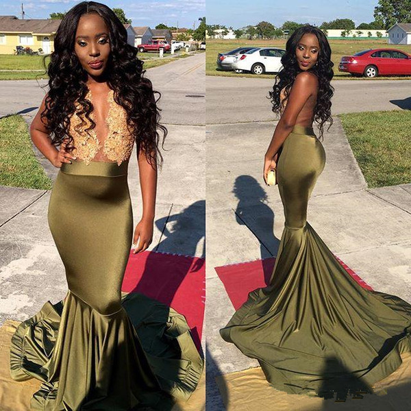 Sexy Long Prom Dress Deep V neck Sleeveless Lace Top Stretch Satin Floor Length Black Girl Mermaid African Prom Dresses 2021