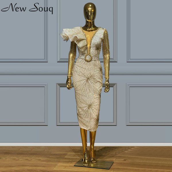 Sexy Tea Length Mermaid Evening Dresses Illusion V Neck Beaded Abendkleider Robes Prom Party Gowns Vestido De Festa