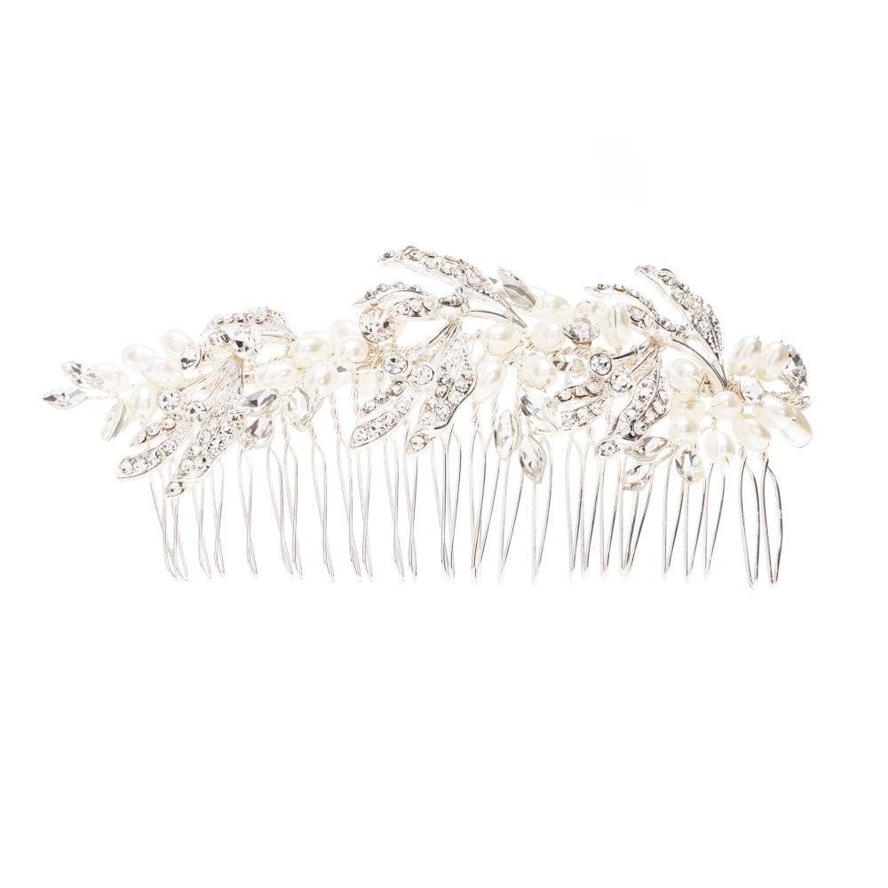 Silver Plated Leaf And Pearl Large Olive Hair Comb