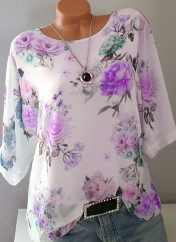 Size Floral Round Neckline Casual Shift 34 Down Blouses