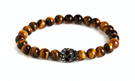 Elasticated tigerseye bead bracelet with a darkly coruscating gunmetal and Swarovski crystal skull. Tigerseye is a lovely striated natural stone with an intriguing kind of inner radiance to it and a silky, dry feel. A very effective pairing of the mineral’s amber to orange tones with the sombre yet cheery presence of the skull motif.