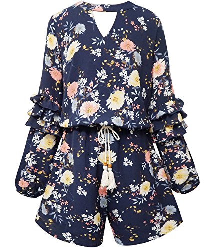 Smukke Big Girls Gorgeous Floral Printed Romper With Tiered Ruffle Long Sleeves (With Options), 7-16 (7, Navy Multi)