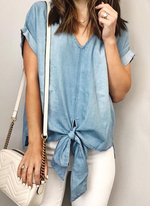 Solid Casual Vneckline Short Sleeve Blouses Women Tops