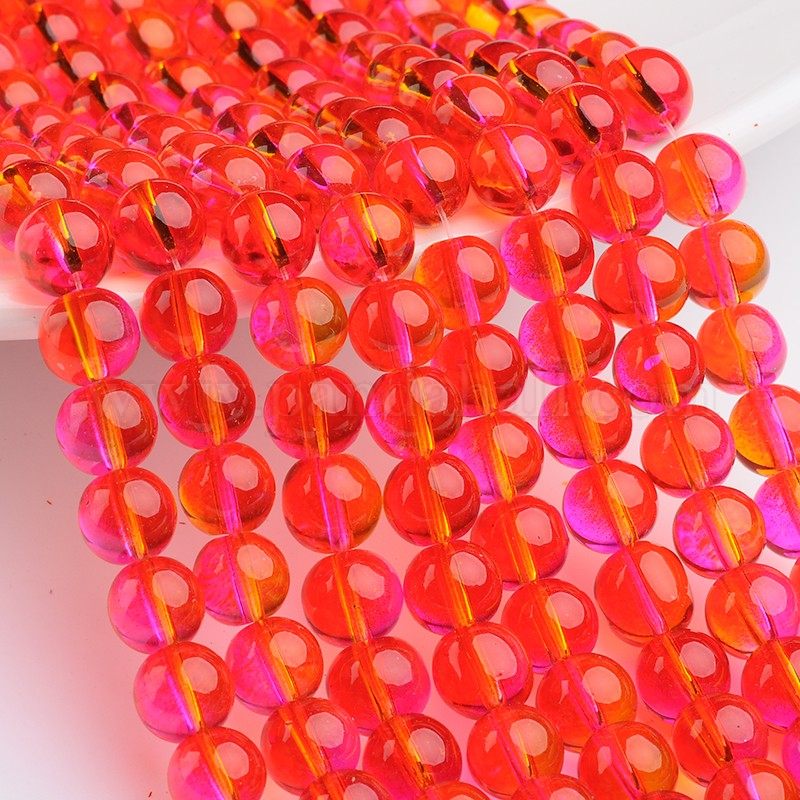 Spray Painted Transparent Glass Bead Strands, Round, DeepPink and MagentaSize: about 8mm in diameter, hole: 1mm; about 104pcs/strand, 31.5″.We’d seen gradual changes in color of the glass beads that make different visual effect. Painted glass beads are gaining popularity attributed to their affordable and gorgeous advantages. How about get these lovely to decorate with your favorite items. Finest material beads would build possible interesting things out.