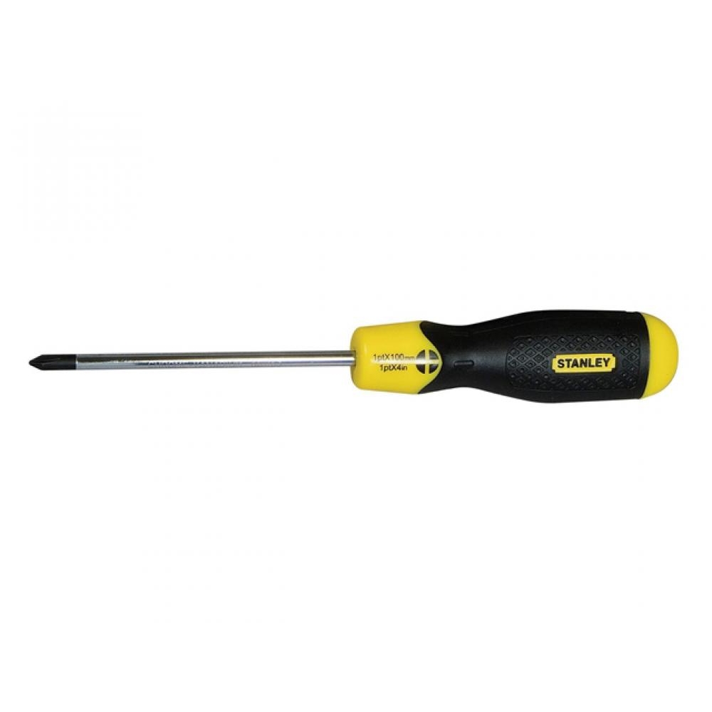 The Stanley Cushion Grip Phillips Tipped screwdrivers have a chrome plated bar which is corrosion resistant, and magnetic tips for easy pick up and screw locator. The soft-grip handle provides excellent torque and comfort. It has a smooth domed end for fast spinning action, speed and comfort, and the large diameter handle offers greater torque which is needed for driving wood screws. Screw tip identification is shown on the handle.Type – PhillipsTip size 3Blade Length 150mm