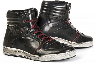 Upper: full grain water-repellent graffiti leather waterproof and breathable lining PU internal protections on both sides Gear protection in leather tone on tone gear Laces (two changeable versions) Anatomic footbed, changeable and breathable microforated Antislip black rubber sole