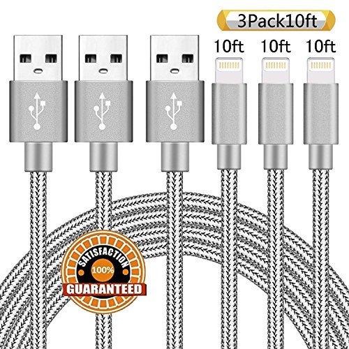Suanna iPhone Cable 3Pack 10FT Nylon Braided Certified Lightning to USB iPhone Charger Cord for iPhone 8 7 Plus 6S 6 SE 5S 5C 5, iPad 2 3 4 Mini Air Pro, iPod Nano 7 (Gray)
