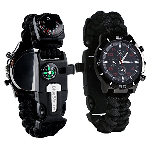6-IN-1 SURVIVAL GEAR: Bracelet Watch + Compass + Whistle + Thermometer + Fire Starter Scraper + Paracord