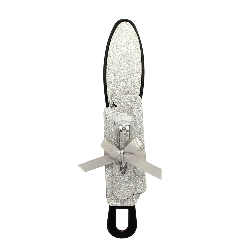 glittering tool set includes a foot file, set of two glittery toe seperators, file and nail clippers.
