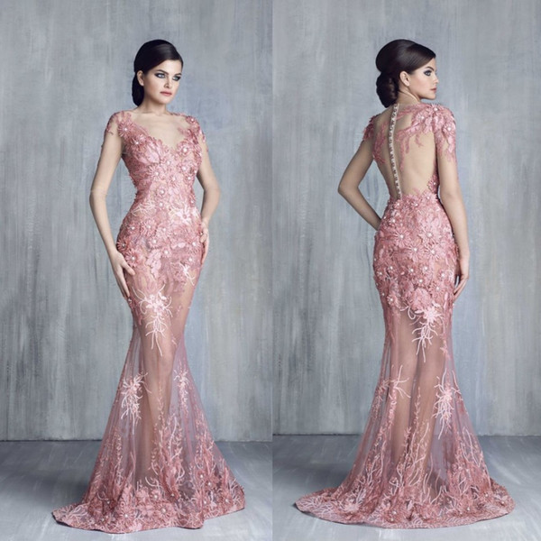 Tony Chaaya Scoop Neck Evening Dresses Short Sleeve Lace Applique Beads Party Formal Gowns Mermaid Floor Length Prom Dress
