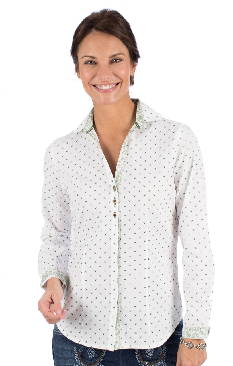 Green dots and paisley pattern on a white background. Our gorgeous costume blouse TALINA in white / green gives every look that certain something. While the long sleeves, back and front are adorned with small green dots and squares, the insides of the cuffs, collar and button placket are adorned with a beautiful paisley pattern. At chest height are three classic stag horn buttons.