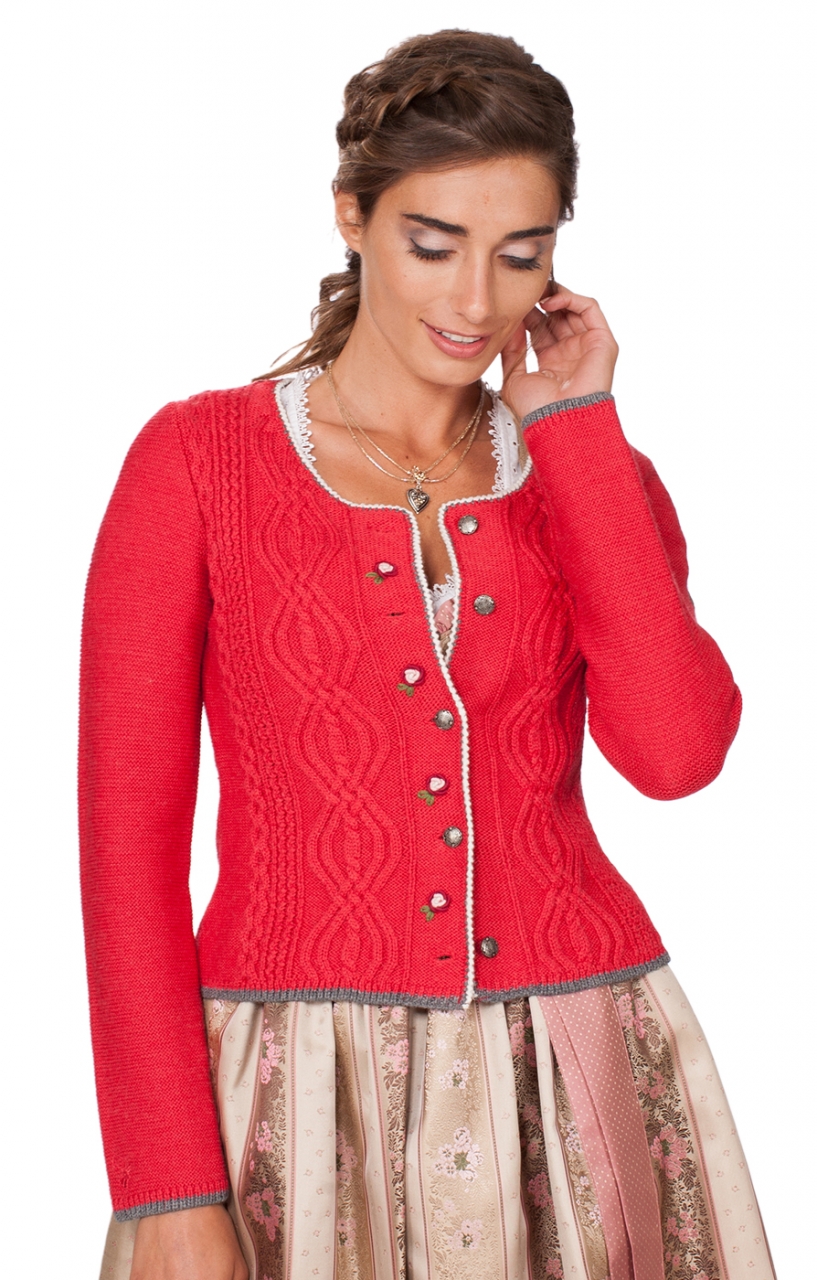 A tasteful and simple traditional cardigan that can be added perfectly straight to any dirndl. The unique look of this Spencer dirndl cardigan comes across as traditional, but is transformed by the patent knit pattern in the front and back, as well as by the contrasting coloured knit edge and the embroidery on the button bar into a sporty and incredibly attractive piece. A practical companion for the cool evenings and perfect for more than just traditional outfits.