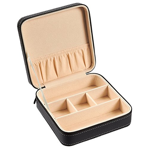 Travel Jewelry Case – Jewelry Carrying Case, PU Leather Organizer Storage Holder for Watches, Rings, Necklaces, with 5 Compartments, Black, 7 x 2.5 x 7 Inches