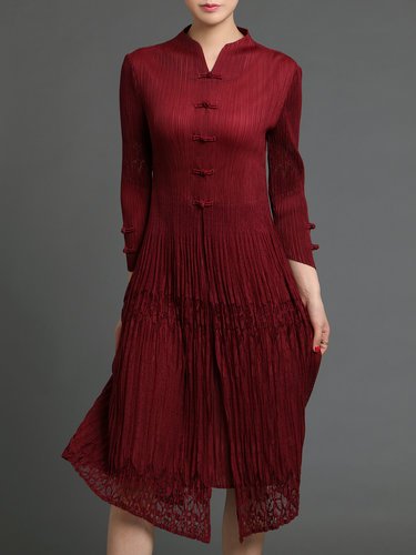 Vintage 3/4 Sleeve Pleated Stand Collar Midi Dress