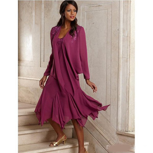 Vintage Elegant Chiffon Plus Size Mother Of The Bride Dresses With Jacket Tea Length Groom Pant Suits Gowns For Weddings