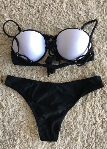 Women Bikini Set Floral Embroidered Faux Pearl Beading Bandage Lace Up Hollow Out Sexy Swimsuit Black