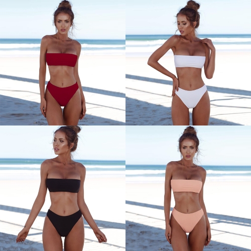 Strapless bandeau style and high-rise waist.