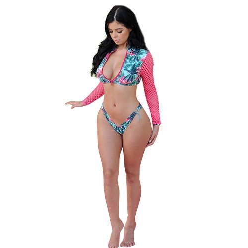 Women Mesh Long Sleeve Zip Front Tankini Swimsuit Floral Crop Swim Shirt Set Swimwear Bathing Suit Beachwear
