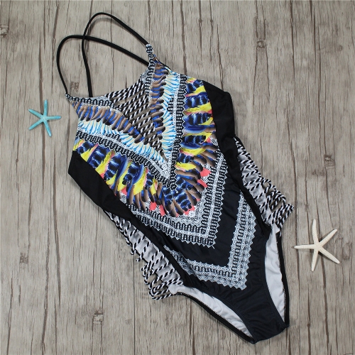 Women One Piece Swimsuit Hollow Out Printed Cross Backless Padded Swimwear Bathing Suit Black/Dark Blue