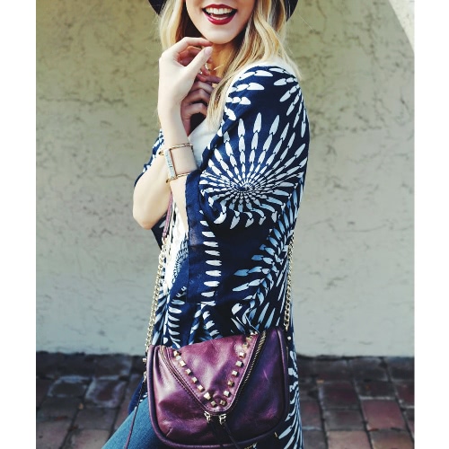 Women Summer Vintage Cardigan Geometry Print Kimono Beach Cover Up Bikini Outwear Dark Blue