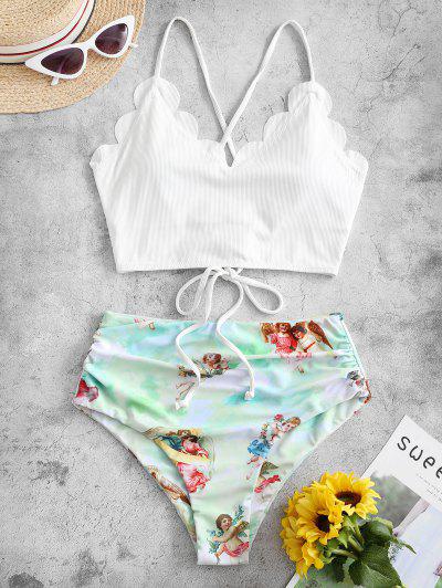 ZAFUL Angel Print Ribbed Lace Up Scalloped Tankini Swimsuit