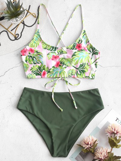 ZAFUL Flower Palm Lace Up Mix and Match Tankini Swimwear