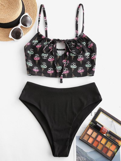 ZAFUL Halloween Skulls Print Tie Ribbed Tankini Swimwear