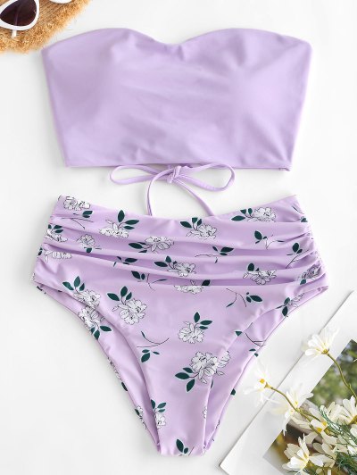 ZAFUL Lace Up Floral Bandeau High Waisted Tankini Swimwear