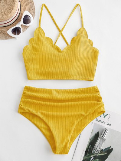 ZAFUL Ribbed Scalloped Lace Up Tummy Control Tankini Swimsuit