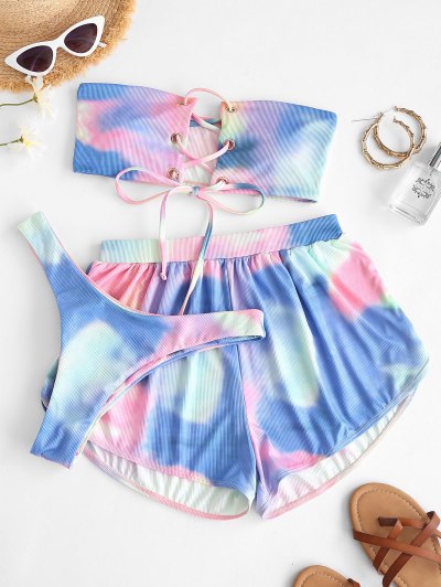 ZAFUL Ribbed Tie Dye Lace Up Bandeau Three Piece Bikini Swimwear